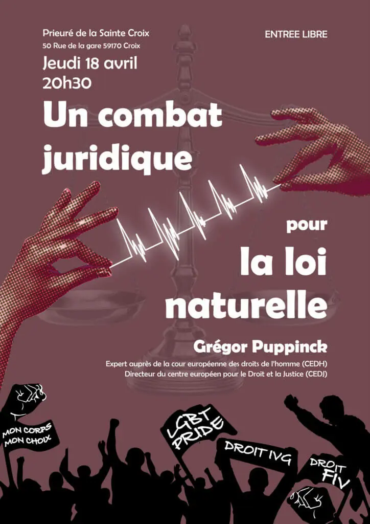 Accueil » Nos archives » Agenda : Conférence “Un combat juridique pour la loi naturelle” le jeudi 18 avril à Croix (59) Summorum Pontificum Agenda : Conférence « Un combat juridique pour la loi naturelle » le jeudi 18 avril à Croix (59) Ce jeudi 18 avril, Gregor Puppinck donne une conférence intitulée « Un combat juridique pour la loi naturelle » au Prieuré de Croix (59). Article précédentFunérailles de Mgr Huonder: Mgr Fellay souligne les rapports des papes avec la Fraternité saint-Pie X Article suivantEncore un événement qui va attirer les foules… 18 avril 2024