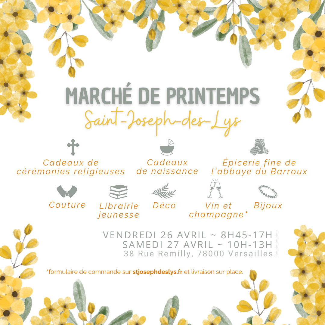 L’Ecole vous invite à son Marché de Printemps le vendredi 26 et le samedi 27 avril dans les locaux de l’Ecole (38 rue Rémilly) à Versailles pour faire vos cadeaux à l’occasion des cérémonies de fin d’année :