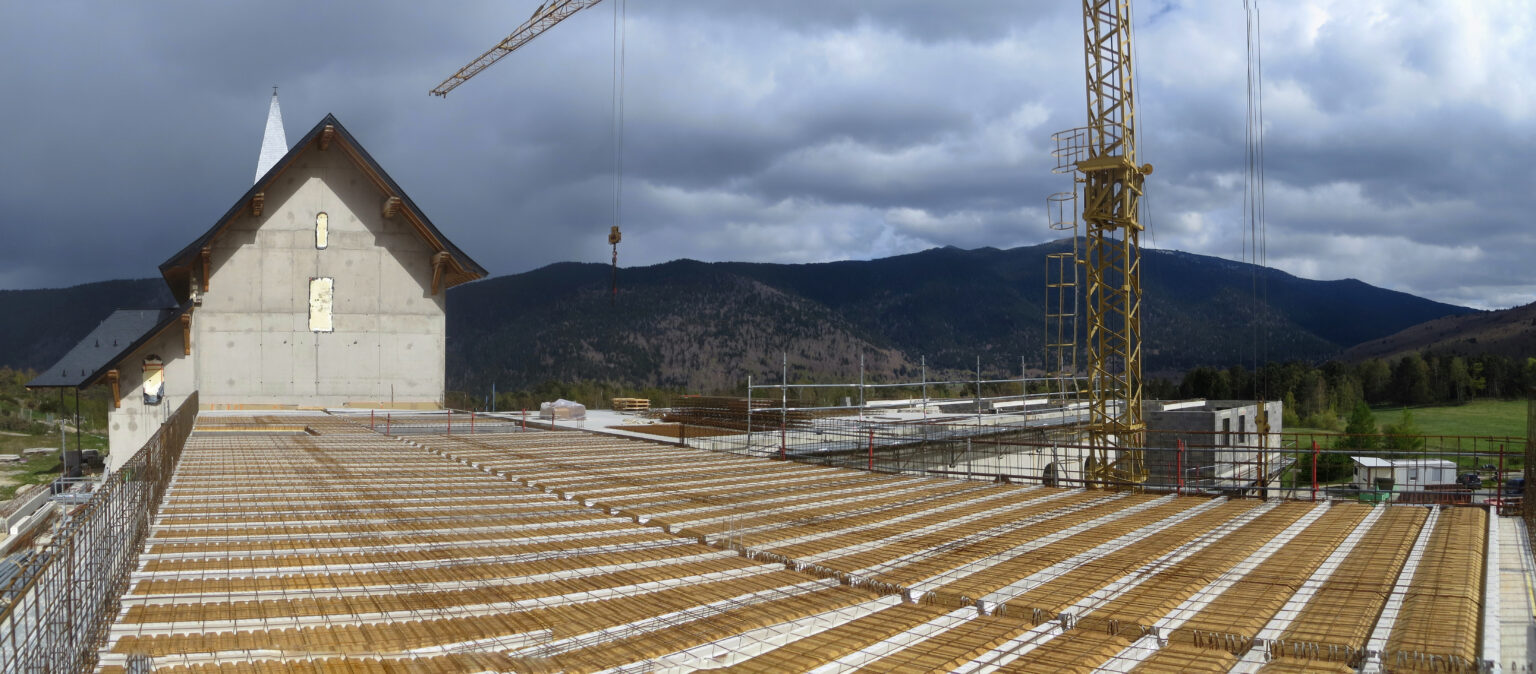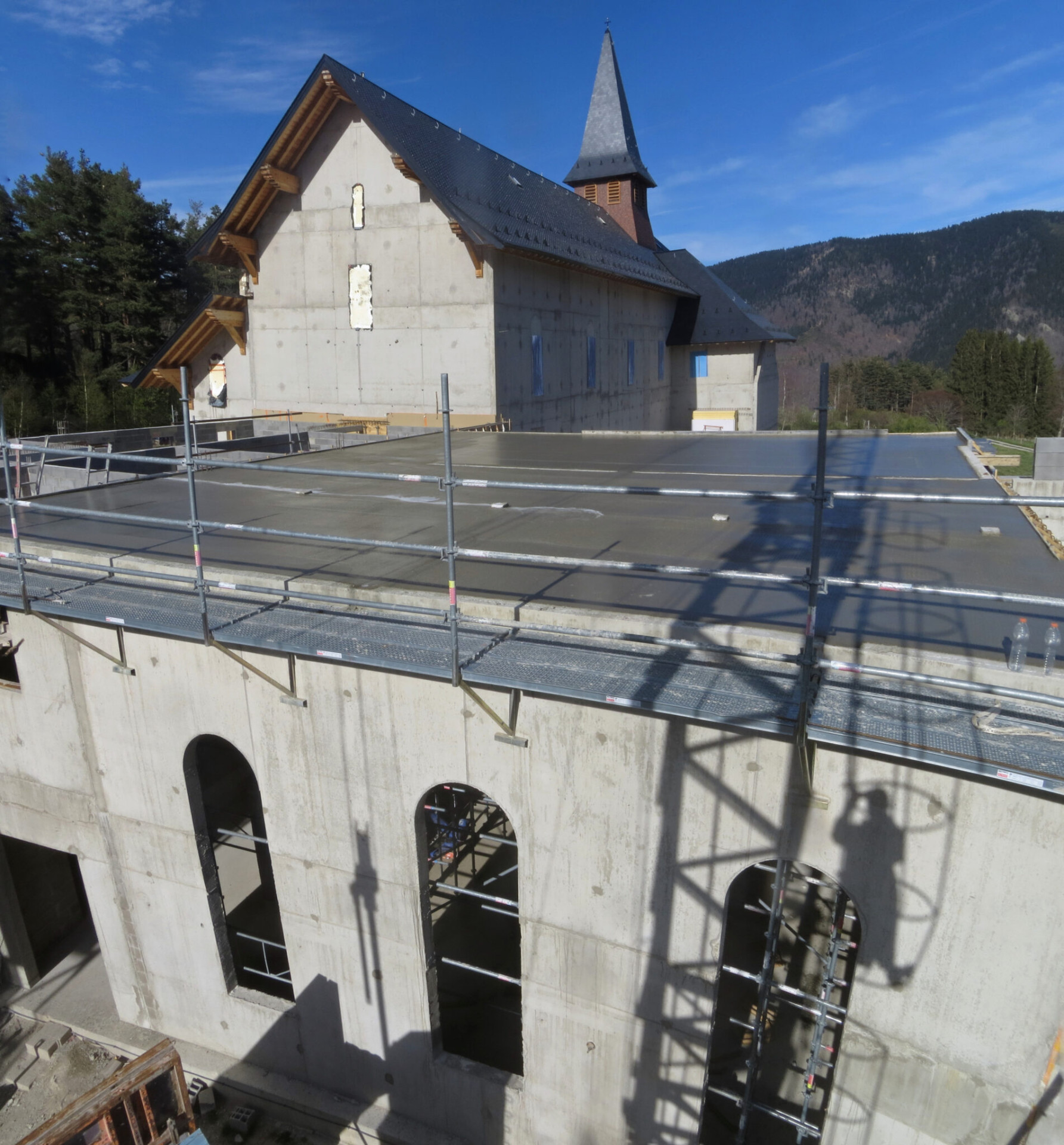 En février, l’équipe des maçons est renforcée. Le plancher de 360 m² du 1er étage de l’aile sud est réalisé le 13 février par un temps magnifique. La pose des poutres du second étage au-dessus du réfectoire et du chapitre provisoire est en cours et l’édification des murs du 1er étage de l’hôtellerie reprend.