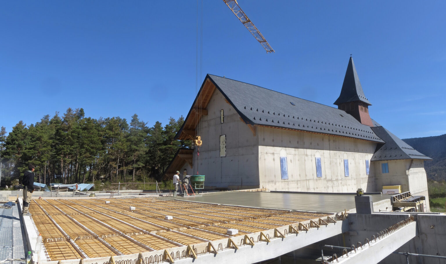 Au mois d’avril, les derniers murs du 1er étage sont achevés, et la pose des planchers du 2nd étage commence avec le coulage de celui au-dessus du réfectoire et du chapitre provisoire le 11.
