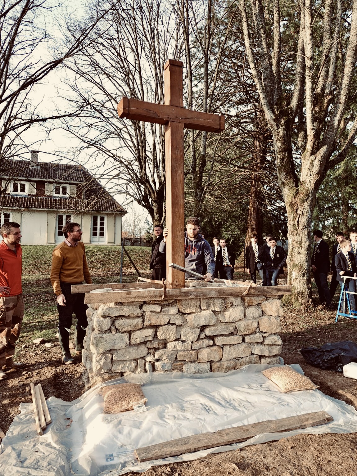 Pendant tout le carême, des pères de famille ont bâti un socle en pierre pour y dresser la croix qui avait été construite par SOS Calvaires lors de leur venue à l’école. Une fois scellée sur son socle, la croix a été bénie le jour des Rameaux.