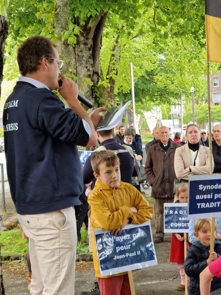 Près de 250 fidèles de St Matthieu et de St Sève (Morlaix) se sont en effet rassemblés devant l’évêché de Quimper, ce dimanche 5 mai pour la liberté liturgique et le maintien de la messe traditionnelle actuellement assurée par la FSSP.