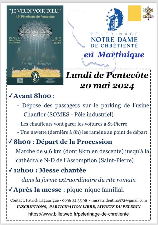 Accueil » Nos archives » Pèlerinage de Pentecôte en Martinique Summorum Pontificum Pèlerinage de Pentecôte en Martinique Un lecteur nous indique qu’un pèlerinage local aura lieu en Martinique le lundi de Pentecôte, en union avec les pèlerins de Chartres, de Somes à Saint-Pierre (Cathédrale Notre-Dame de l’Assomption). S’inscrire en ligne Messa tridentina (Facebook) Article précédentEmission Terres de Mission (n°361, 5 mai 2024) Article suivantAgen : nominations diocésaines 6 mai 2024