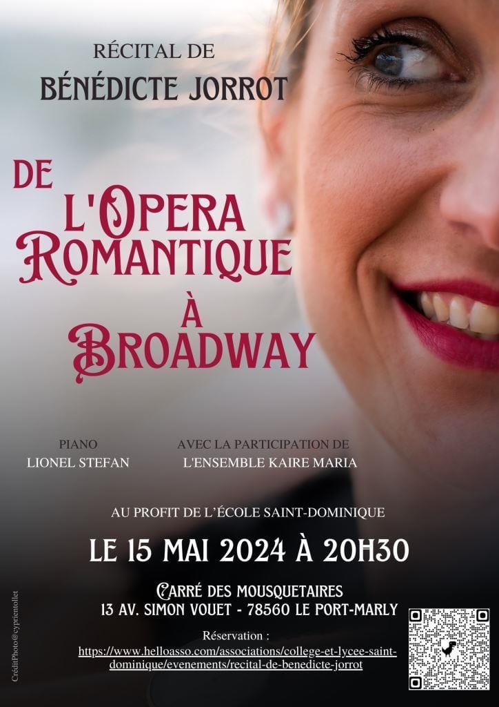 Pour soutenir le groupe scolaire, l’école Saint Dominique (Le Pecq) vous invite à venir le récital de Bénédicte Jorrot, chef de choeur de l’Ensemble Kaïre Maria, professeur de chant, soliste professionnelle, intitulé « de l’opéra romantique à Broadway » au Carré des Mousquetaires (Port-Marly).