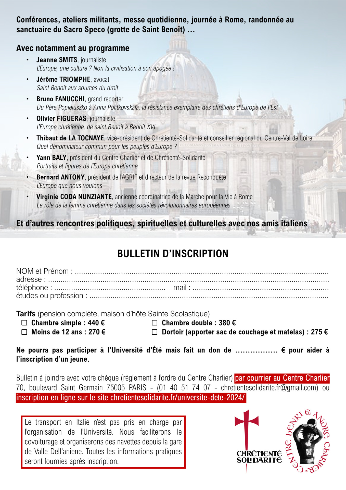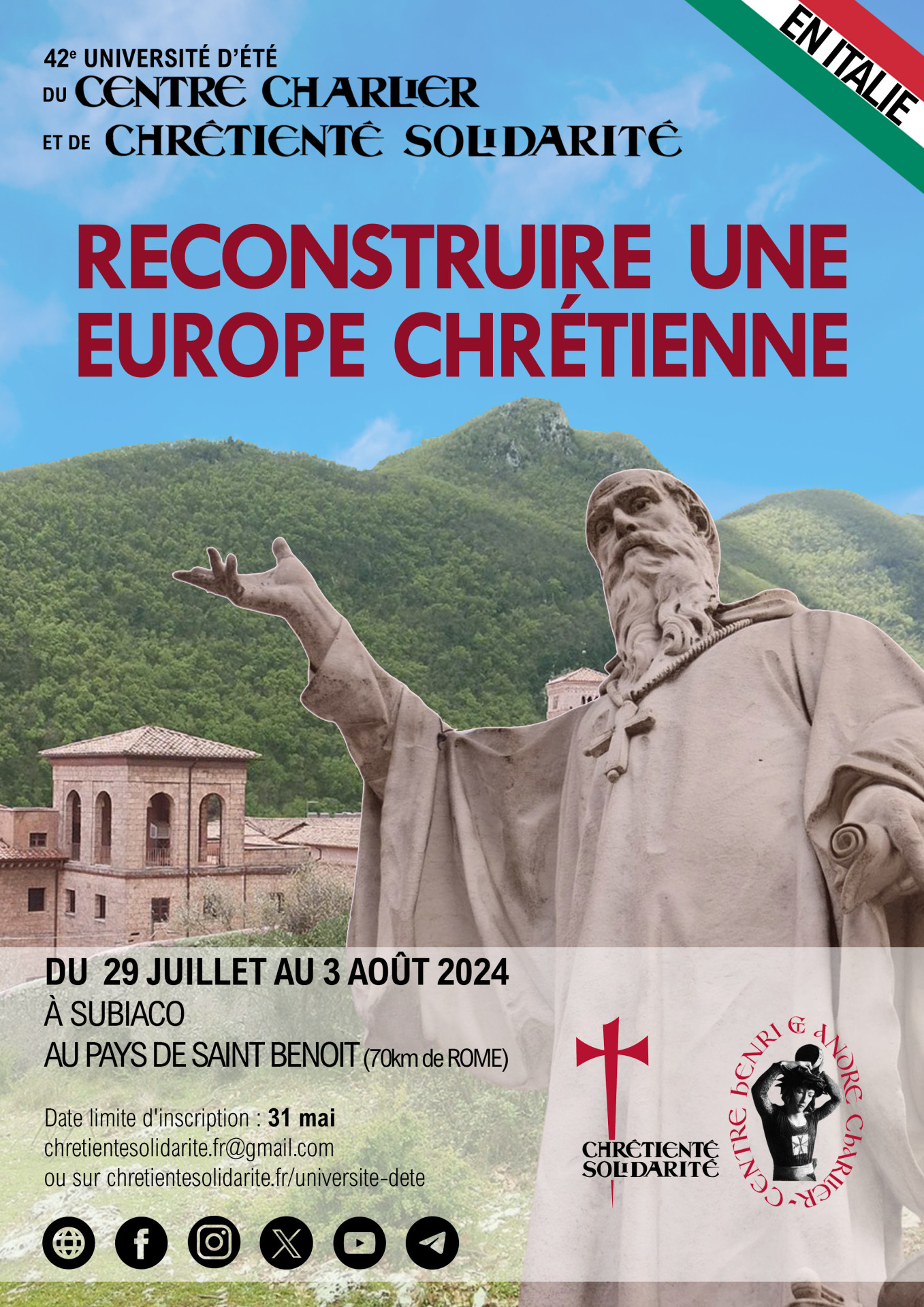 Accueil » Nos archives » Agenda : Université d’été du Centre Charlier à Subiaco (Italie) du 29 juillet au 3 août Summorum Pontificum Agenda : Université d’été du Centre Charlier à Subiaco (Italie) du 29 juillet au 3 août Le Centre Charlier et Chrétienté Solidarité organisent le 42è Université d’été à Subiaco (Italie) : Renseignements et inscriptions Article précédentDeux églises profanées à Livry-Gargan (93) et Louvroil (59) Article suivantLa messe du dimanche de Pentecôte du Pèlerinage sera retransmise sur CNews 7 mai 2024