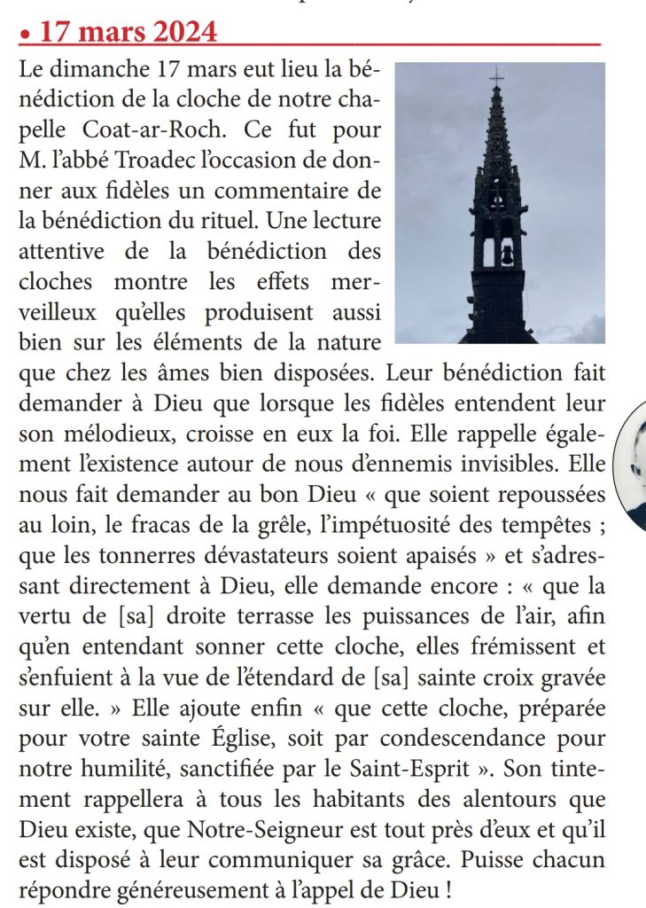 Léguée par le collectionneur Jean Pirche qui l’avait restaurée et meublée de sa collection d’objets religieux, la chapelle de Coat ar Roch à Lannedern, dans le centre du Finistère, a été rendue au culte par la FSSPX. Le 17 mars dernier, la cloche du clocher a été bénie par l’abbé Troadec. Bâtie sur l’ermitage et la source – de saint Edern, elle date du XVIe siècle – bien que le bas du clocher est daté de 1699, a été restaurée en 1874 et à partir des années 1970 par Jean Pirche.