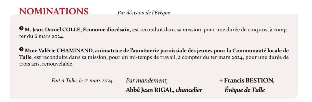 Accueil » Nos archives » Tulle : nominations complémentaires Informations Tulle : nominations complémentaires Voici des nominations complémentaires dans le diocèse de Tulle, faites en mars 2024, parues dans le journal diocésain de mai : Article précédentParis, Viviers, Bourges : personne n'échappe à la langue de buis Article suivantL'obligation de préserver la vie 20 mai 2024
