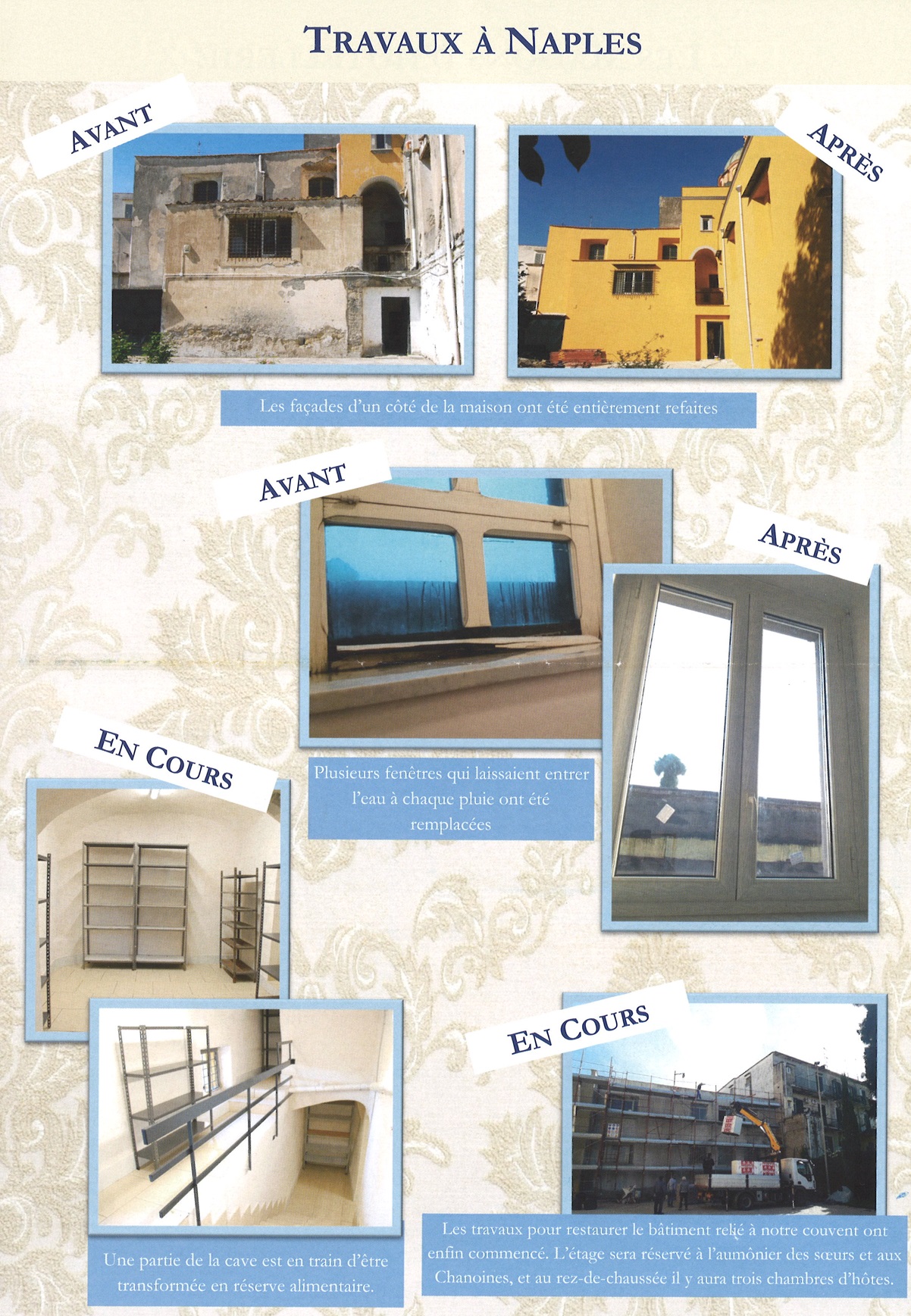 Ces derniers mois, 5 postulantes ont reçu l’habit, 4 novices ont prononcé leurs premiers voeux et 4 autres sont entrées cette année en année de discernement. La communauté compte 71 Soeurs adoratrices réparties dans 9 maisons : 3 en Italie (dont le noviciat à Naples), 1 en Allemagne, 1 en Suisse, 1 en Angleterre, 1 en Irlande, 1 aux Etats-Unis et 1 en France (Maison Notre-Dame de Bonne Délivrance – Loisy – 60). Elles ont toujours beaucoup de travaux à réaliser dans leur noviciat de Naples.