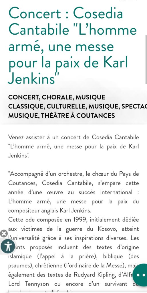 - le 26 mai dans la cathédrale de Coutances (Manche) à 19h; l’annonce de l’office de tourisme indique en toutes lettres que cette oeuvre comprend « des textes d’origine islamiques (l’appel à la prière)« . Il n’est pas fait mention des tarifs en ligne.
