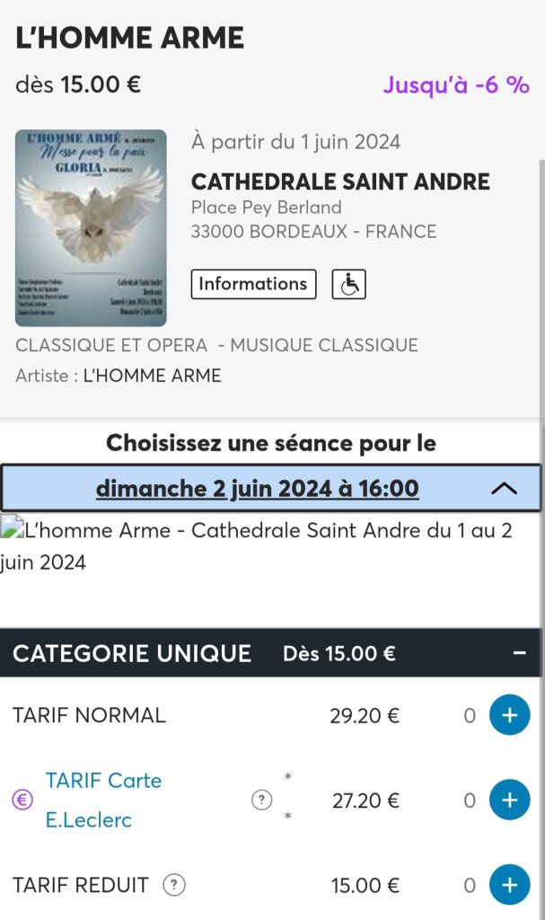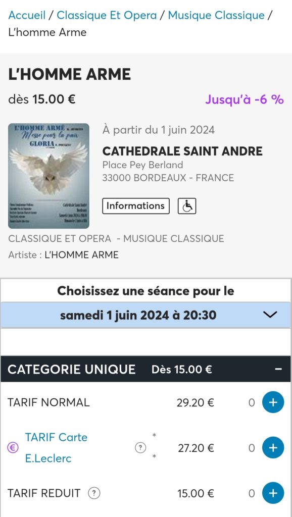 - le 1er juin dans la cathédrale de Bordeaux et le 2 juin à 16h plein tarif 29.2 €, tarif réduit 15 euros – il s’agit clairement d’un événement commercial, et pas à la portée de toutes les bourses qui plus est. Et sur le site de l’association organisatrice on trouve même des places à 32 euros. [MAJ : l’appel à la prière musulmane ne sera pas chanté]