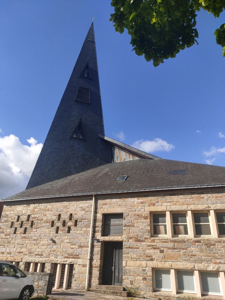 L’église du Sacré Cœur du Moustoir qui est des années 1960 fait, toujours d’après le cadastre, 30 mètres de côté et 20 en façade. Ses murs sont plus fins – corollaire, elle coûte aussi à chauffer (cf. OF 1/2023), mais il y a dessous une salle qui fait toute la longueur, avec une estrade au fond et aux normes, rénovée en 2022, et plus facile à chauffer. Il y a aussi des sanitaires, annexes etc.