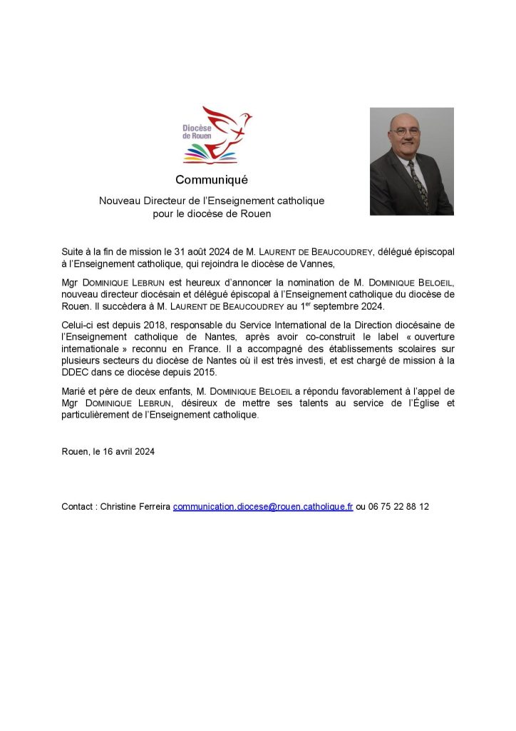 Suite au départ de Laurent de Beaucoudray pour le diocèse de Vannes, Dominique Beloeil devient directeur diocésain et délégué épiscopal à l’enseignement catholique du diocèse de Rouen à partir de septembre. Il était depuis 2018 responsable du service international de la direction diocésaine de l’enseignement catholique de Nantes depuis et très engagé dans l’éducation européenne, comme il expliquait en 2021 sur le site de la maison de l’Europe à Nantes dont il venait d’intégrer le bureau :