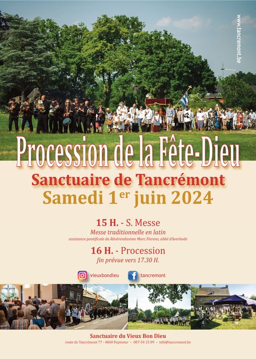 A l’occasion de la fête Dieu, une messe traditionnelle avec assistance pontificale du TRP Marc Fierens, abbé de l’abbaye prémontrée d’Averbode (Belgique) le samedi 1er juin à 15h00 au Sanctuaire du Vieux Bon Dieu de Tancrémont (30 km au sud est de Liège). Une Procession de la Fête Dieu aura lieu à l’issue de la messe à 16h00.