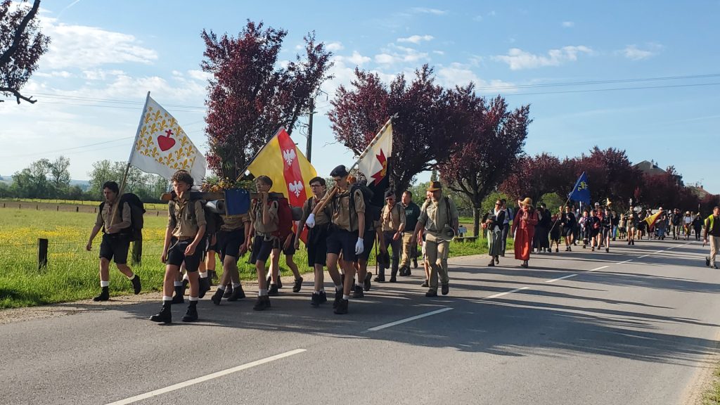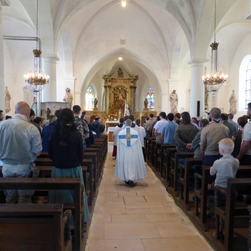 Une première étape à la chapelle Notre-Dame de Bermont, lieu privilégié des apparitions de saint Michel, sainte Catherine et sainte Marguerite, puis la messe chantée de la solennité de sainte Jeanne d’Arc dans l’église de Goussaincourt, ont jalonné la route du matin, avant d’arriver au pique-nique convivial de Champougny. La marche de l’après-midi a été clôturée par un salut du Saint-Sacrement à Vaucouleurs, avec l’accueil chaleureux de la paroisse, avant la dispersion devant la Porte de France et la chapelle castrale édifiée au-dessus de la crypte de Notre-Dame des Voûtes, témoin du passage de Jeanne en 1429. Ces 22 kilomètres de marche sous le soleil ont permis de préparer les lorrains pour le Pèlerinage de Chrétienté à Chartres dès la fin de semaine. »