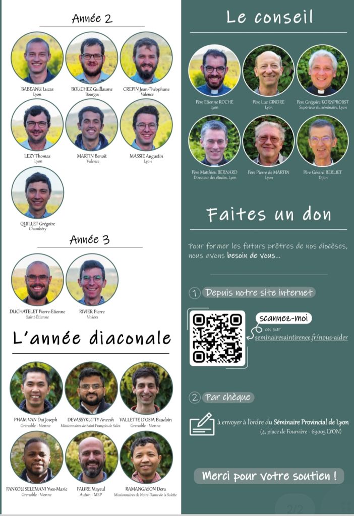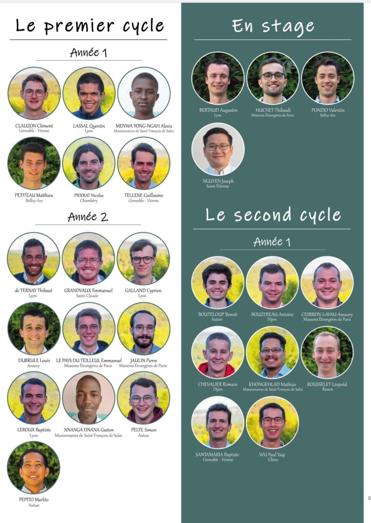 Voici le trombinoscope du séminaire Saint-Irénée de Lyon pour l’année 2023-2024. Il compte, au 1er septembre 2023, 37 séminaristes et 6 diacres issus de 13 diocèses, de Chine (1 séminariste) et de deux communautés (MEP et Missionnaires Saint-François de Sales, ces derniers sont situés à Annecy). Les diacres proviennent de Grenoble (3), des MEP (1, issu du diocèse d’Autun), des missionnaires de Saint-François de Sales précités (1) et des Missionnaires de Notre-Dame de la Salette, dans l’Isère.