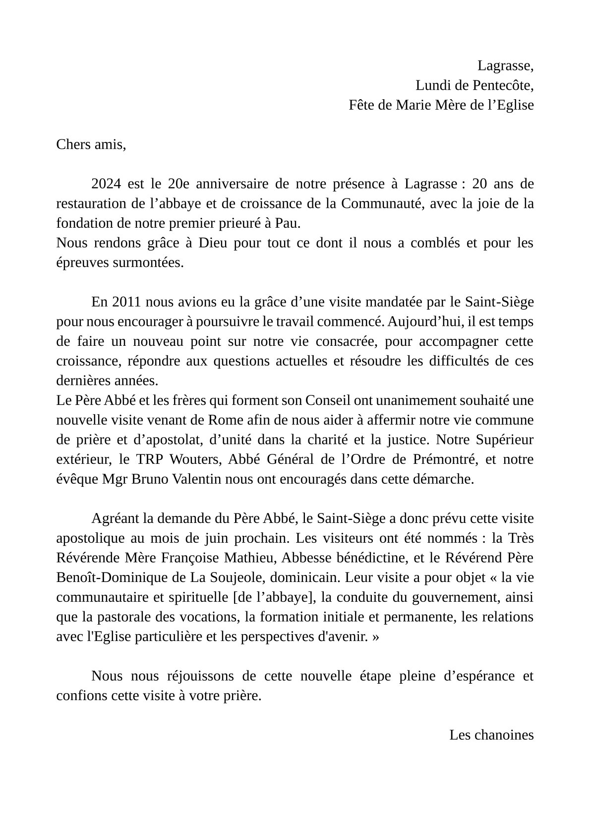 Les Chanoines Réguliers ont annoncé qu’ils allaient faire l’objet d’une visite canonique à leur demande pour étudier « la vie communautaire et spirituelle [de l’Abbaye], la conduite du gouvernement, la pastorale des vocations, la formation initiale et permanente, les relations avec l’Eglise particulière et les perspectives d’avenir ».