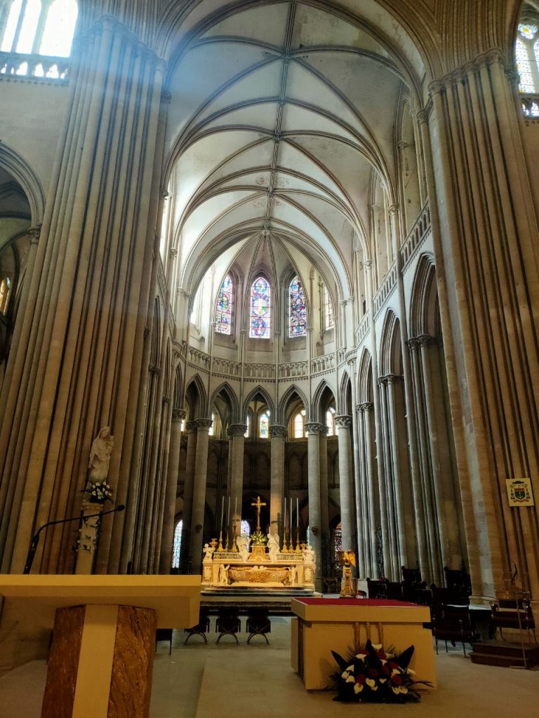 Le nouvel autel est dépouillé, mais la Croix est présente sur l’autel historique au fond du chœur.