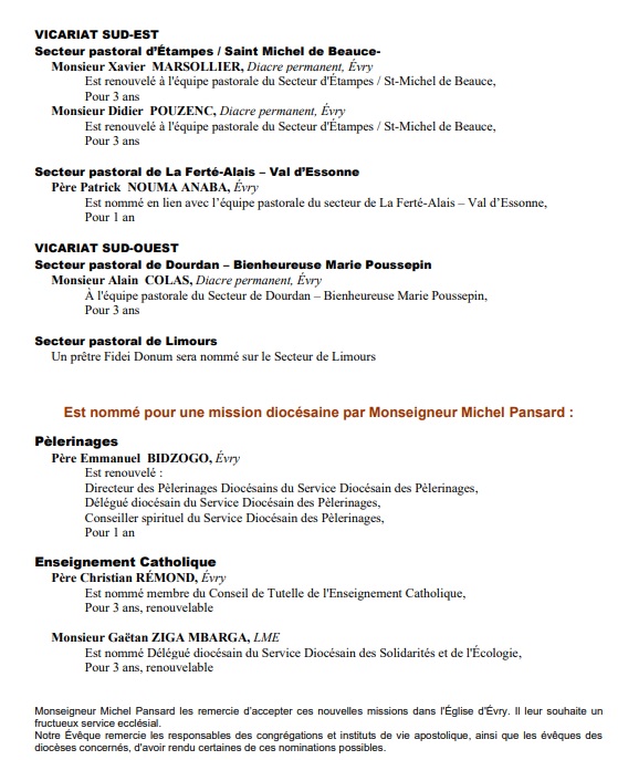 Monseigneur Michel Pansard remercie celles et ceux qui acceptent ces nouvelles missions dans l’Église d’Évry. Il leur souhaite un fructueux service ecclésial.