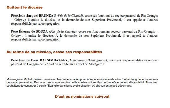 Voici les nominations diocésaines de la rentrée à Evry (91), parues en plusieurs vagues :