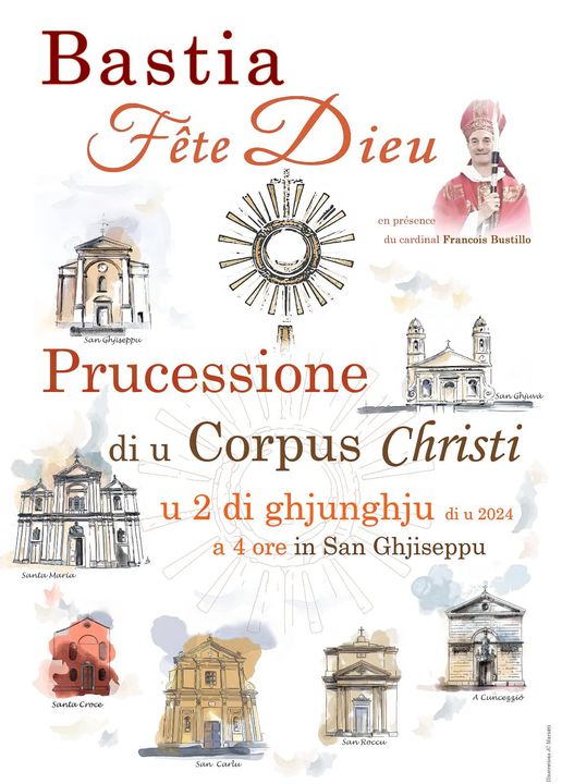 Le cardinal François Bustillo, évêque d’Ajaccio, présidera la procession du Saint Sacrement le dimanche 2 juin à 16h00 au départ de l’église Saint Joseph à Bastia :