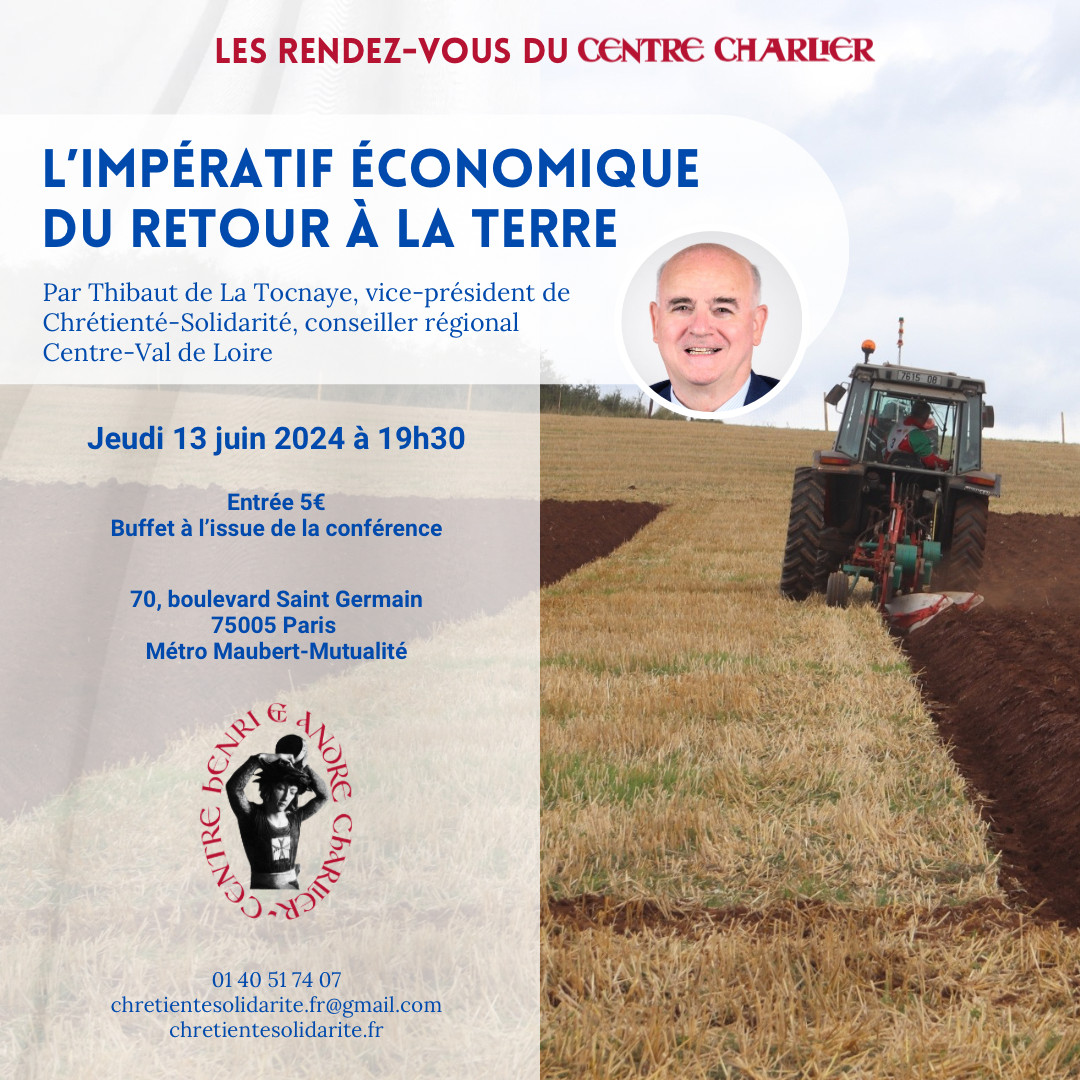 Dans le cadre du cycle de conférences 2023-2024 du Centre Charlier, Thibaut de La Tocnaye viendra évoquer un sujet d’actualité : “L’impératif économique du retour à la terre” le jeudi 13 juin à 19h30 au Centre Charlier (Paris).
