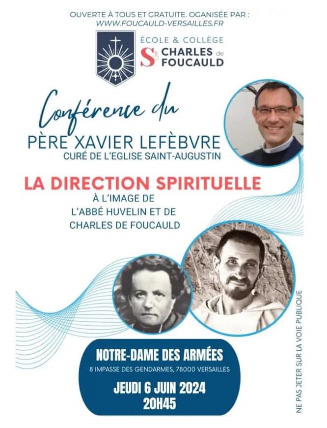 L’Ecole et le Collège Saint Charles de Foucauld (Versailles) organise une conférence sur la direction spirituelle à l’image de l’abbé Huvelin et Charles de Foucauld par le Père Xavier Lefebvre (curé de Saint-Augustin à Paris) ce jeudi 6 juin à 20h45 à Notre-Dame des Armées (Versailles) :