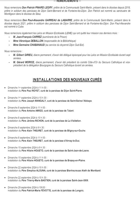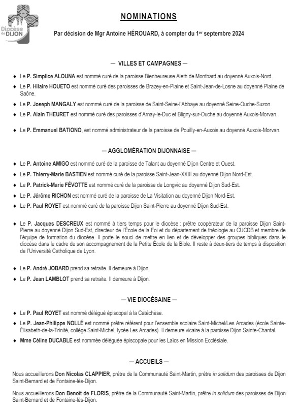 Accueil » Nos archives » Dijon : les nominations diocésaines de la rentrée En Une Dijon : les nominations diocésaines de la rentrée La première vague des nominations du diocèse de Dijon est parue. Entre autres, deux des prêtres de la communauté Saint-Martin s’en vont… à Cuba et sont remplacés par deux nouveaux prêtres de la même communauté. Article précédentLe style de Jésus Article suivantBrèves : Prochaines messes traditionnelles à Lorient 9 juillet 2024