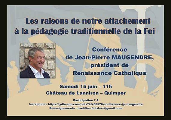 Dans le contexte de répression contre les fidèles attachés à la messe traditionnelle dans le diocèse de Quimper, Jean-Pierre Maugendre, président de Renaissance, donnera une conférence sur le thème « Les raison de notre attachement à la pédagogie traditionnelle de la Foi » ce samedi 15 juin à 11h00.