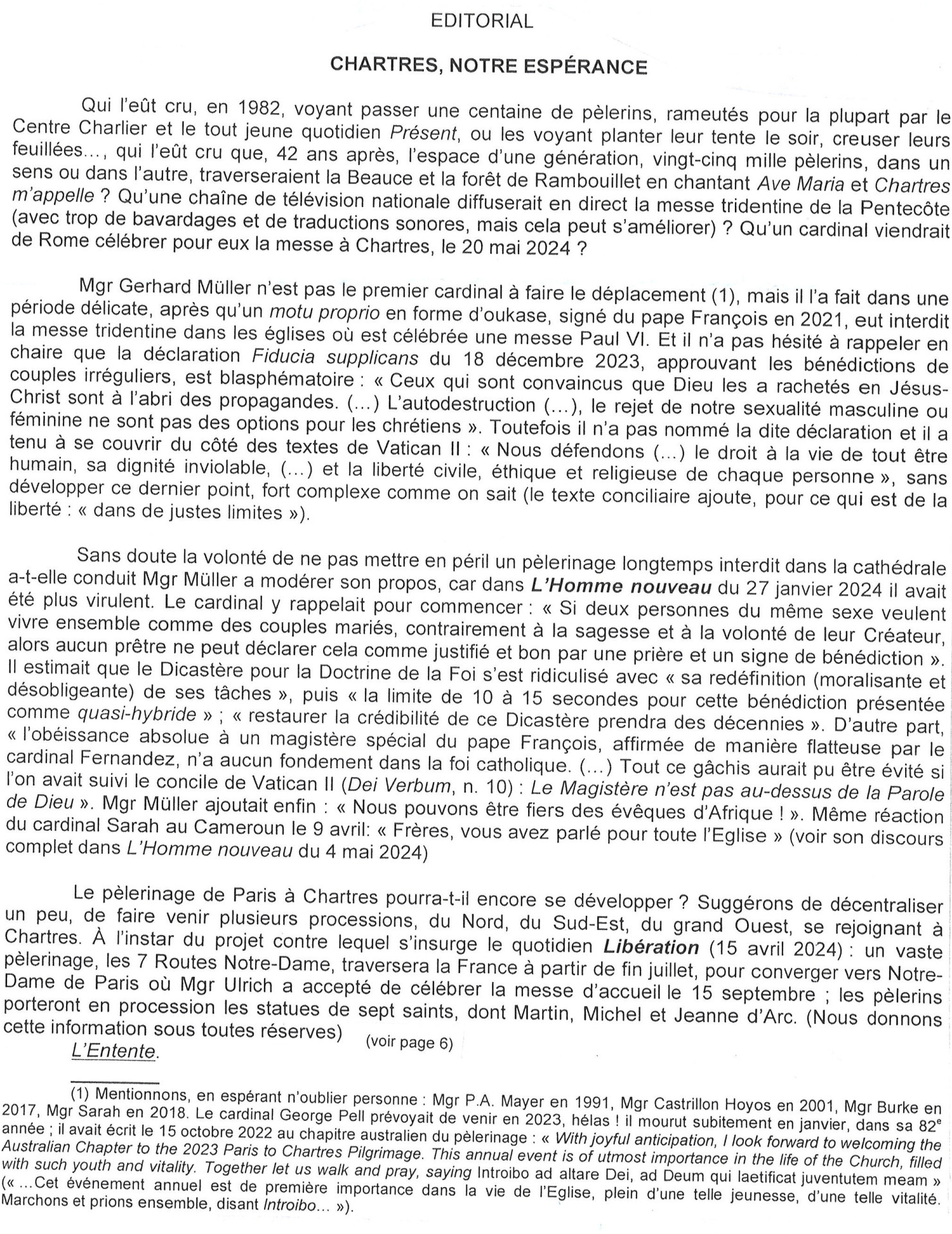 L’éditorial du dernier numéro de L’Entente Catholique de Bretagne (Mai, Juin 2024, n°259) évoque le dernier Pèlerinage de Chartres :