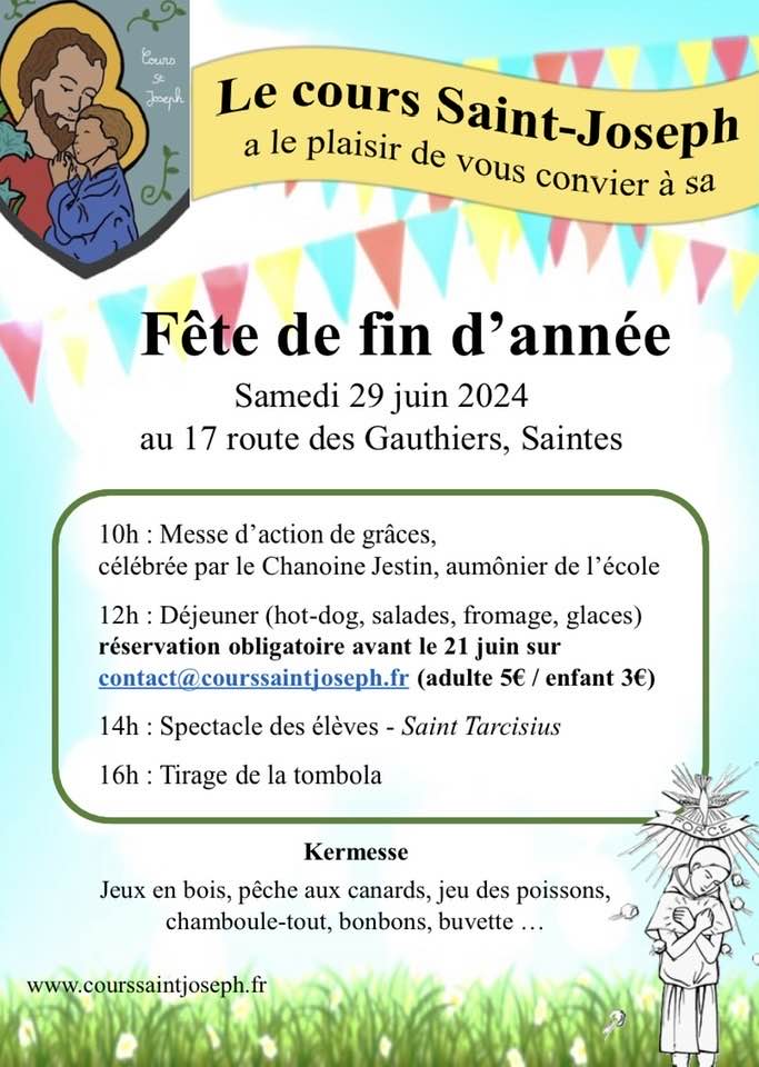 Fondée en 2021 par un groupe de parents, le Cours Saint-Joseph à Saintes est une école primaire qui compte 42 élèves. L’aumônerie est assurée par le chanoine Laurent Jestin, Institut du Christ Roi.