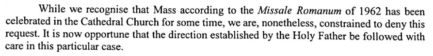 Si nous reconnaissons que la messe selon le Missale Romanum de 1962 est célébrée depuis un certain temps dans l’église cathédrale, nous sommes néanmoins contraints de refuser cette demande. Il est désormais opportun que la direction établie par le Saint-Père soit suivie avec attention dans ce cas particulier.[Traduction par nos soins]