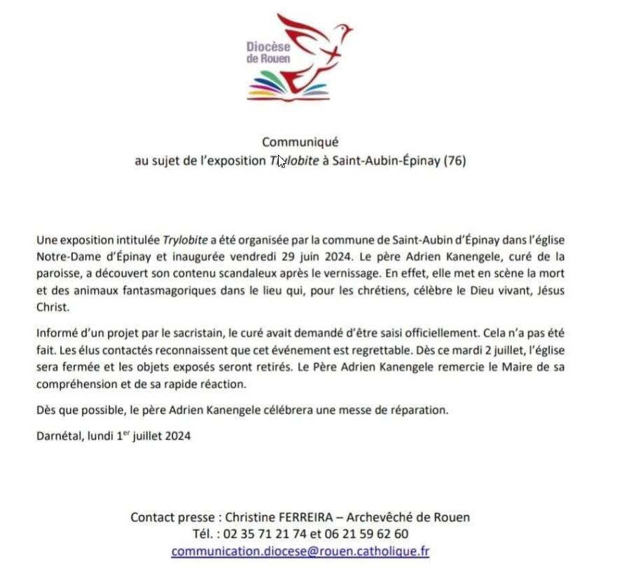 Les fidèles de Saint-Aubin Epinay et du diocèse de Rouen se sont faits entendre, après que leur église ait accueilli une exposition d’objets ouvertement sataniques, sous couvert d’art contemporain; le diocèse de Rouen communique sur la fermeture de l’église et le retrait des objets exposés dès ce mardi 2 juillet. Une messe de réparation sera aussi célébrée, annonce le diocèse, qui a tout de même du mal à abandonner la langue de buis et à appeler un chat un chat.