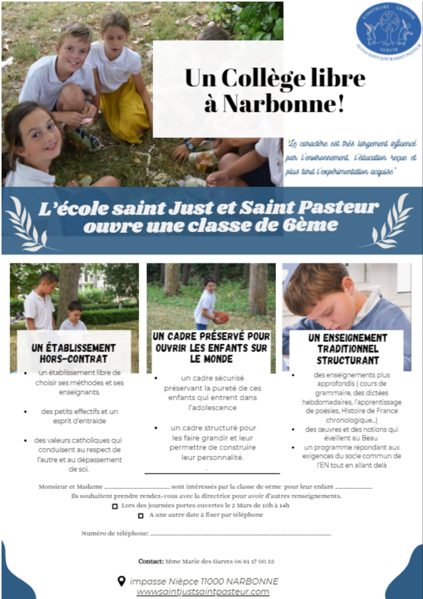 A la rentrée de septembre 2024, l’école ouvre un collège (classe de 6ème). Il reste quelques places.