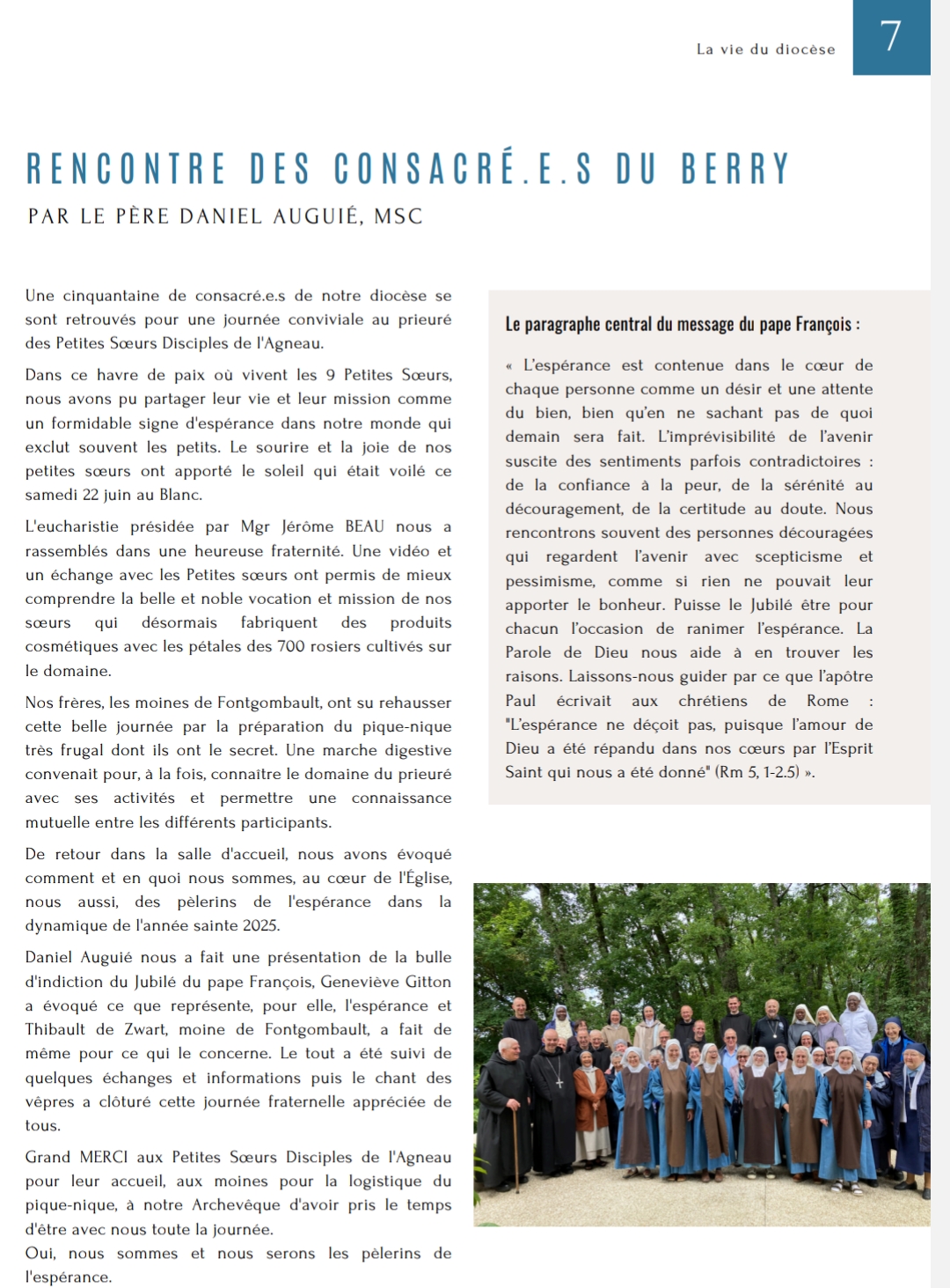 Le diocèse de Bourges – qui englobe les départements du Cher et de l’Indre – a une bien curieuse façon d’évoquer la rencontre diocesaine de la vie consacrée, dans son numéro d’été, entre deux brèves sur la beauté des vitraux et des fresques dans les églises du Berry.