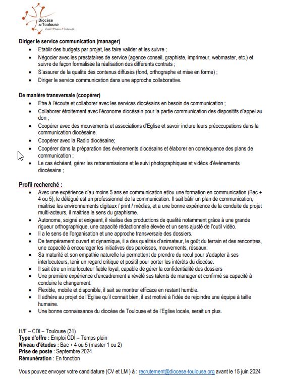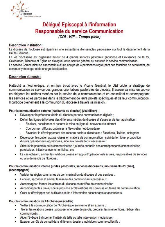 Accueil » Nos archives » Le diocèse de Toulouse cherche un communicant Informations Le diocèse de Toulouse cherche un communicant Le diocèse de Toulouse recherche un directeur de la communication, avec un « regard critique et positif« , tout en étant « fiable loyal« , mais aussi « autonome, soigné et exigeant », et « humble« . Et ce, dès septembre. Fiche de poste : Article précédentRome exige que les Dominicaines du Saint-Esprit pratiquent régulièrement le Novus Ordo Article suivantLe Secours catholique s'emploie à contester les OQTF 26 juillet 2024