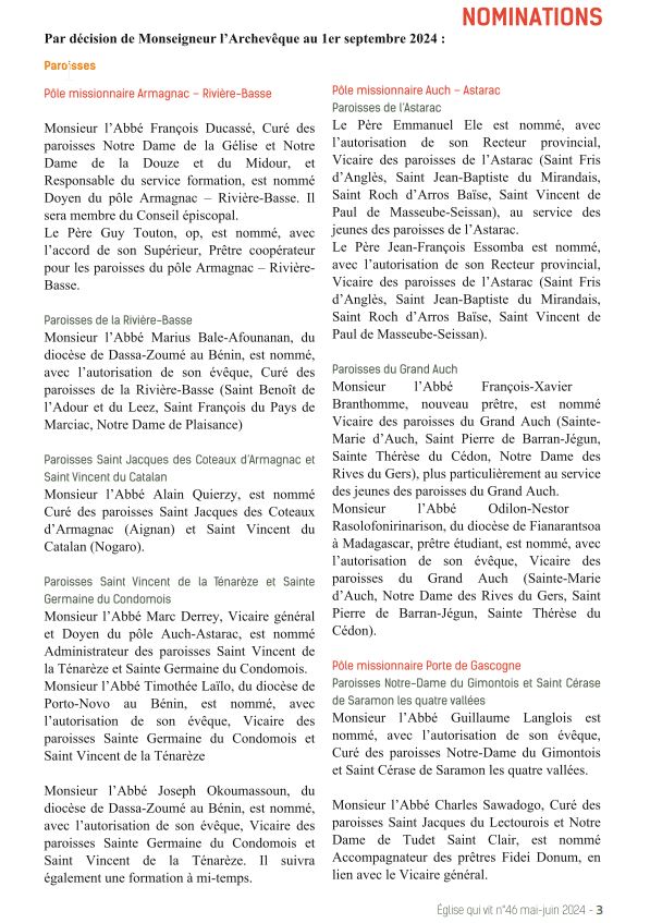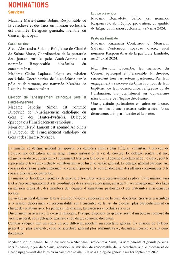 Accueil » Nos archives » Auch : les nominations diocésaines Informations Auch : les nominations diocésaines Voici les nominations diocésaines d’Auch pour septembre, parues dans la lettre diocésaine de mai-juin dernier ; entre autres, une déléguée générale, jusque là responsable de la catéchèse, est nommée, il s’agit de Marie-Jeanne Béline : Article précédentSon et lumière dans la cathédrale Saint-Jean à Lyon Article suivantInstallation des Adoratrices du Coeur Royal à Bruxelles 14 octobre 2024