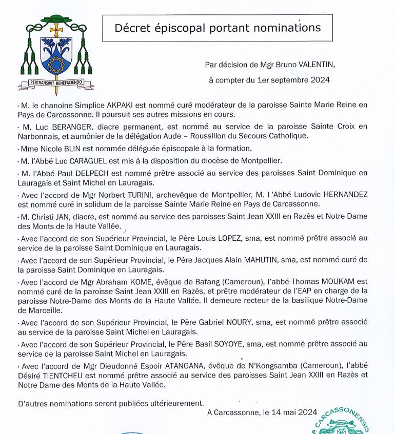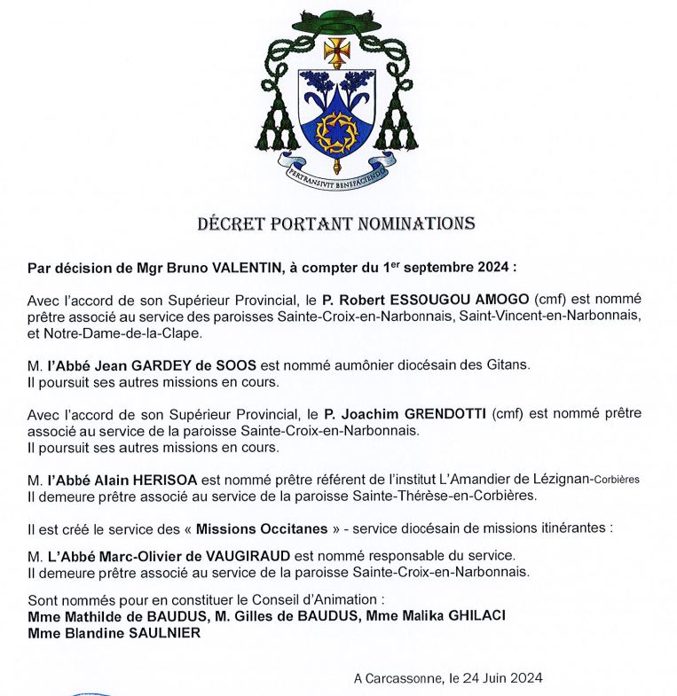Mgr Valentin, évêque de Carcassonne et de Narbonne, a procédé à deux vagues de nominations pour la rentrée.