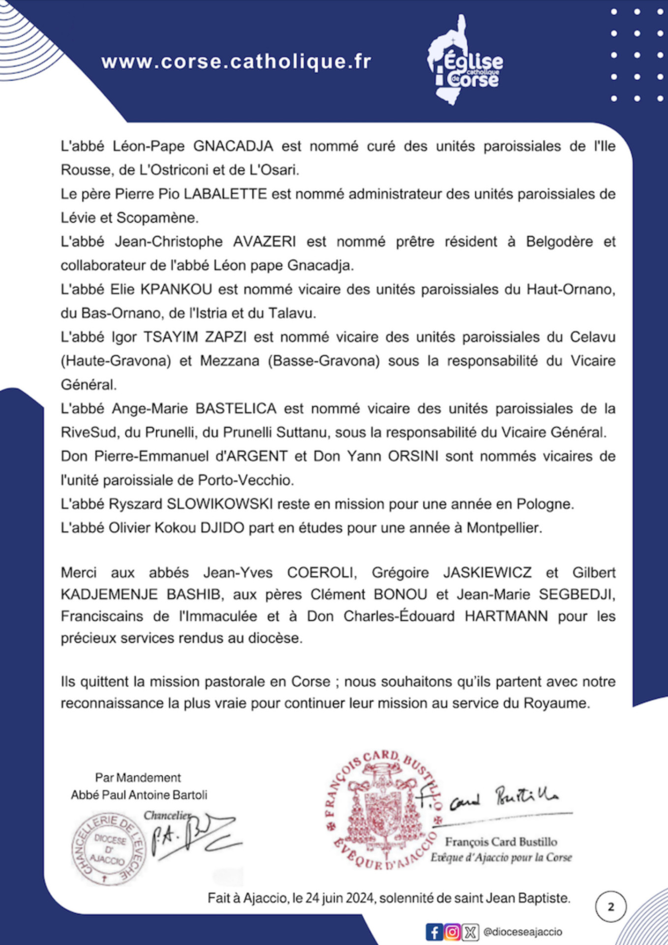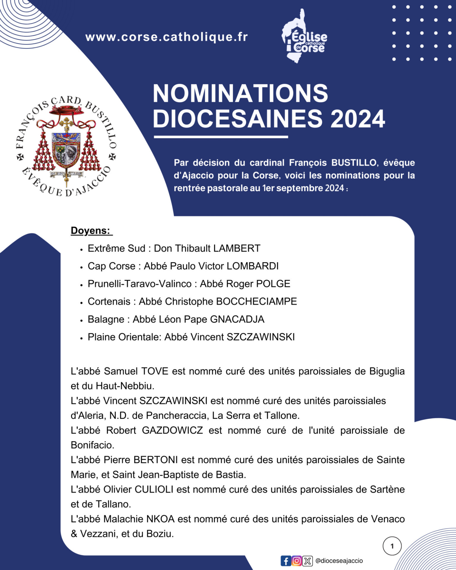 Accueil » Nos archives » Corse : les nominations de la rentrée 2024 Informations Corse : les nominations de la rentrée 2024 Voici les nominations de la rentrée 2024 en Corse : Article précédentUne vérité professée dès les temps apostoliques Article suivantLa messe de saint Pie V mise en quarantaine ? 14 août 2024