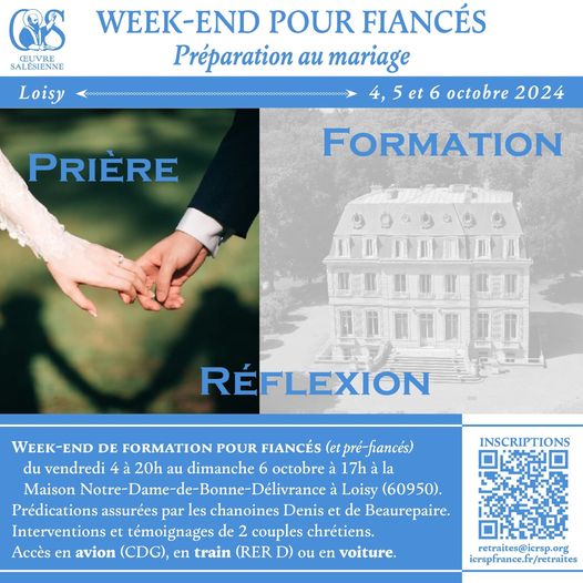 Inscription sur https://icrspfrance.fr/retraites_salesiennes.php?retraite=442 jours de prière, de formation et de réflexion, sous le regard de Dieu en vue du mariage.-> Prédicateurs : Chanoines Alban Denis et François de Beaurepaire.-> Interventions et témoignages de deux couples chrétiens sur la parentalité et la transmission de la vie.-> Pour les fiancés et pré-fiancésDate : du vendredi 4 (soir) au dimanche 6 octobre 2024 (17h)Lieu : Maison Notre-Dame-de-Bonne-Délivrance à Loisy (60950)Participation : 190 € pour deux(Nul ne doit être empêché de participer pour des raisons financières)