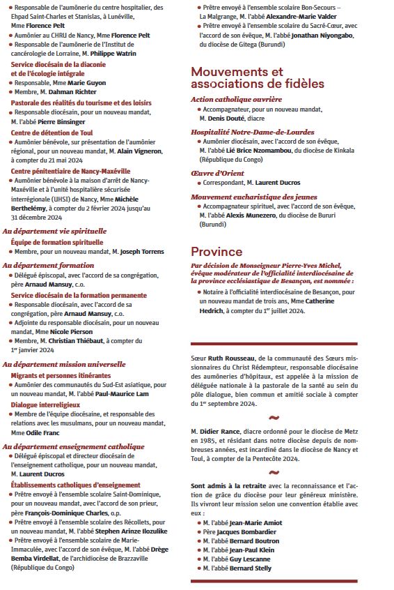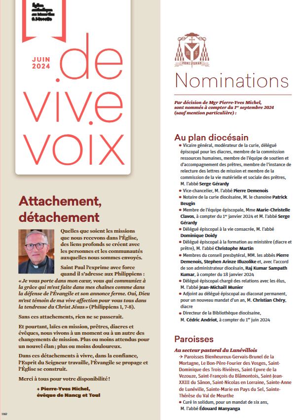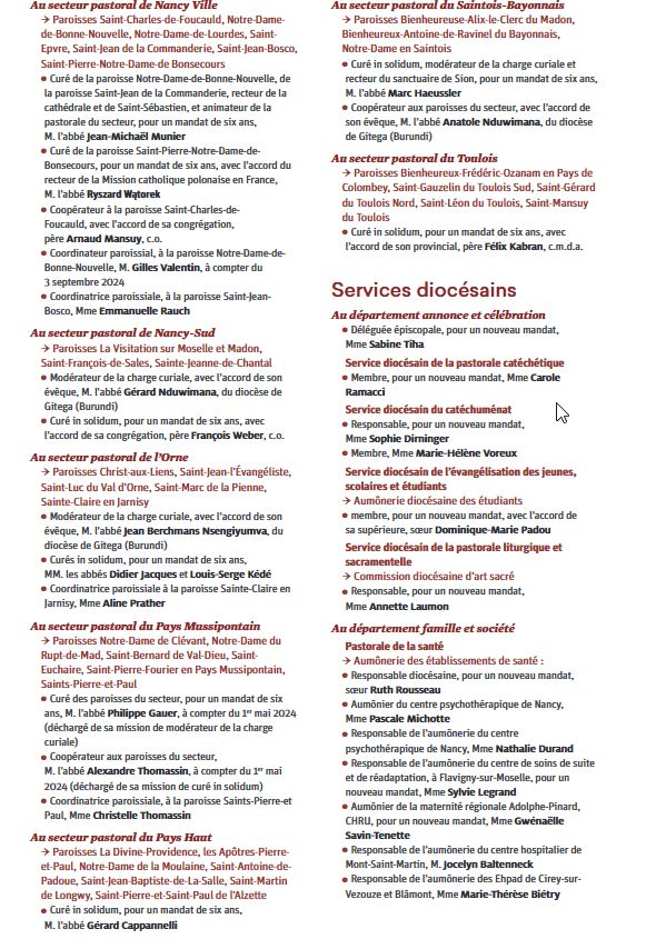 Accueil » Nos archives » Nancy : les nominations diocésaines Informations Nancy : les nominations diocésaines Voici les nominations diocésaines de Nancy, parues fin juin et effectives en septembre : Article précédentEmission Terres de Mission (n°376, 15 septembre 2024) Article suivantDiocèse d'Albi : monition de Mgr Balsa 15 septembre 2024