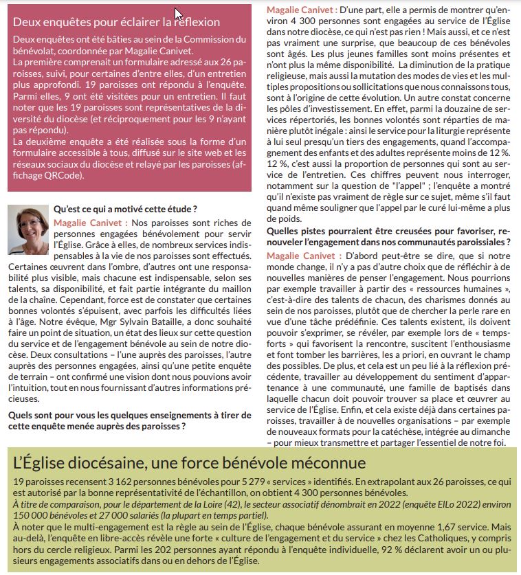 Les résultats sont publiés dans la lettre diocésaine d’été : « 19 paroisses recensent 3162 personnes bénévoles pour 5279 « services » identifiés; en extrapolant aux 26 paroisses, ce qui est autorisé par la bonne représentativité de l’échantillon, on obtient 4300 personnes bénévoles. A titre de comparaison le secteur associatif de la Loire dénombrait en 2022 150.000 bénévoles et 27.000 salariés ».