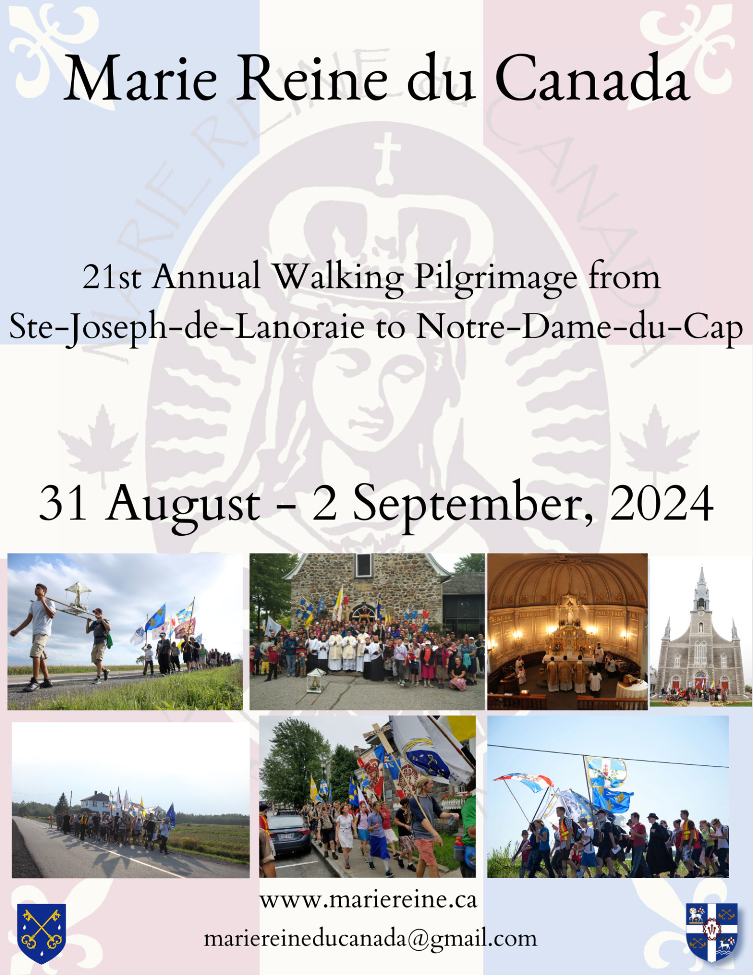 Pour la 21è année, les pèlerins canadiens attachés à la messe traditionnelle relieront Saint Joseph de Lanoraie à Notre-Dame du Cap (Québec) à pieds (100 km) du 31 août au 2 septembre. L’aumônerie est assurée par des prêtres de la Fraternité Saint-Pierre et des prêtres diocésains.