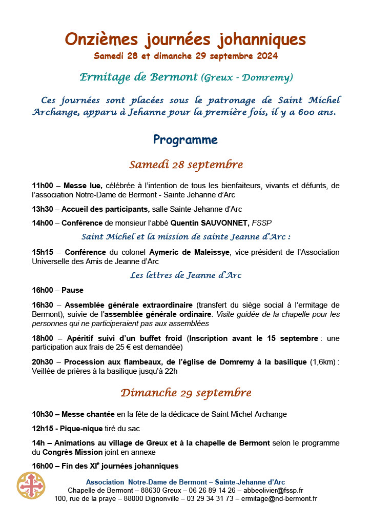 Le samedi 28 et le dimanche 29 septembre 2024 auront lieu les 11è Journées Johanniques à l’ermitage Notre-Dame de Bermont (Vosges).