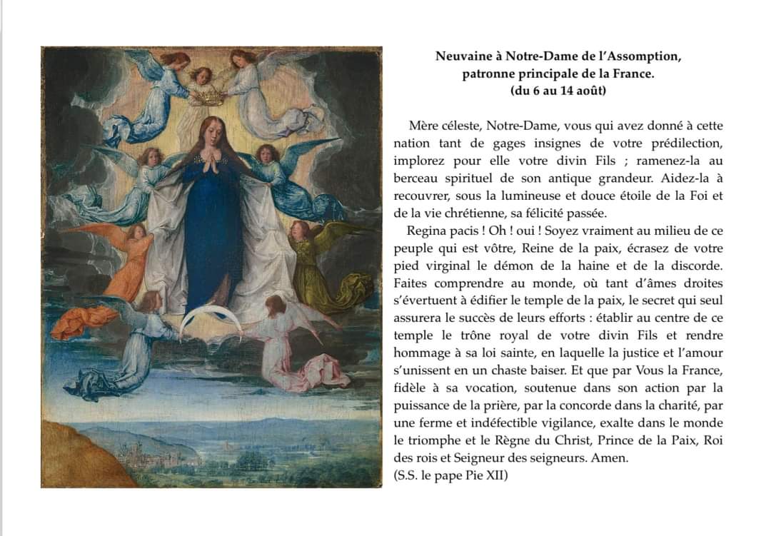 Accueil » Nos archives » Une Neuvaine pour préparer la fête de l’Assomption (6 au 15 août) En Une Une Neuvaine pour préparer la fête de l’Assomption (6 au 15 août) Lu sur Missa Tridentina – Facebook (Messe traditionnelle en Martinique) Article précédentMgr Wintzer et la liturgie Article suivantInstitut d'Argentré Sainte-Anne (Sées) : 100% de réussite au bac 6 août 2024