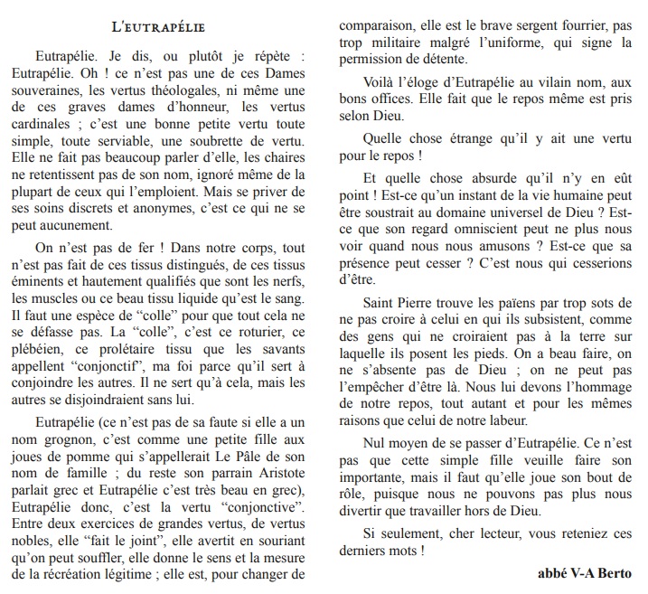 Accueil » Nos archives » L’eutrapélie, par l’abbé Victor-Alain Berto En Une L’eutrapélie, par l’abbé Victor-Alain Berto Pioché dans le bulletin d’été du prieuré FSSPX du Brémien dans l’Eure – qui dessert aussi la chapelle de Chartres, près de la gare SNCF, ce petit texte de l’abbé Victor-Alain Berto qui explique ce qu’est la vertu d’eutrapélie. Article précédent[Credo] La Sainte Vierge Marie : Mère de Dieu, Immaculée Conception, Assomption... Article suivant« Fiducia supplicans est enterrée, on n’en parlera plus » 17 août 2024