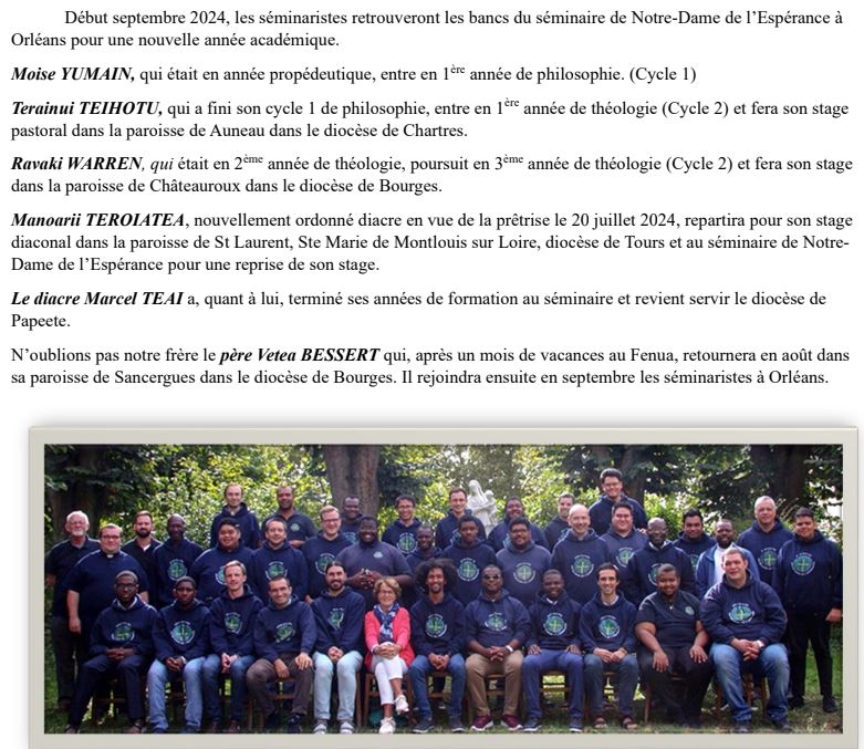A l’occasion de l’ordination d’un de ses séminaristes, Manoarii Teroiatea, comme diacre en vue du sacerdoce le 20 juillet dernier, le diocèse de Papeete donne des nouvelles de ses séminaristes, rentrés au pays pour l’été et qui vont repartir continuer leur formation en France à la rentrée.