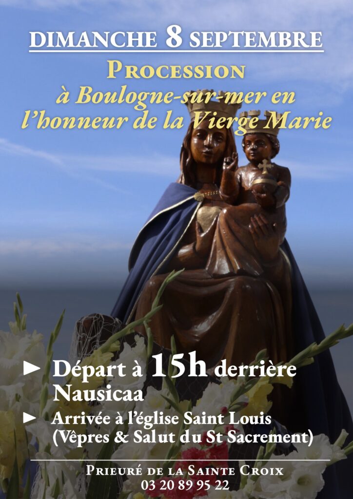 Accueil » Nos archives » Agenda : Procession à Boulogne-sur-Mer en l’honneur de la Sainte-Vierge le 8 septembre Summorum Pontificum Agenda : Procession à Boulogne-sur-Mer en l’honneur de la Sainte-Vierge le 8 septembre Le 8 septembre, la Fraternité Saint-Pie X commémore l’apparition de la Sainte-Vierge à Boulogne sur Mer en 636 : Eglise Saint-Louis de Boulogne-sur-Mer (FSSPX) Article précédentBrève: Chapitre annuel de l’Institut du Christ Roi Souverain Prêtre Article suivantDeuxième jour du pèlerinage de Walsingham 24 août 2024