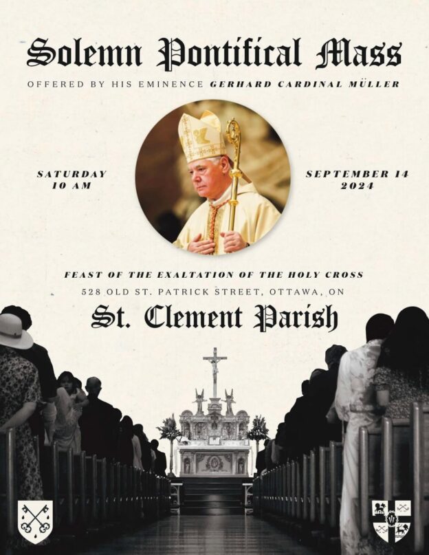 Le cardinal Gerhard Müller, préfet émérite du Dicastère de la Doctrine de la Foi, sera en visite à Ottawa en septembre. A cette occasion, il célébrera une messe traditionnelle en la paroisse Saint-Clément à Ottawa le samedi 14 septembre :