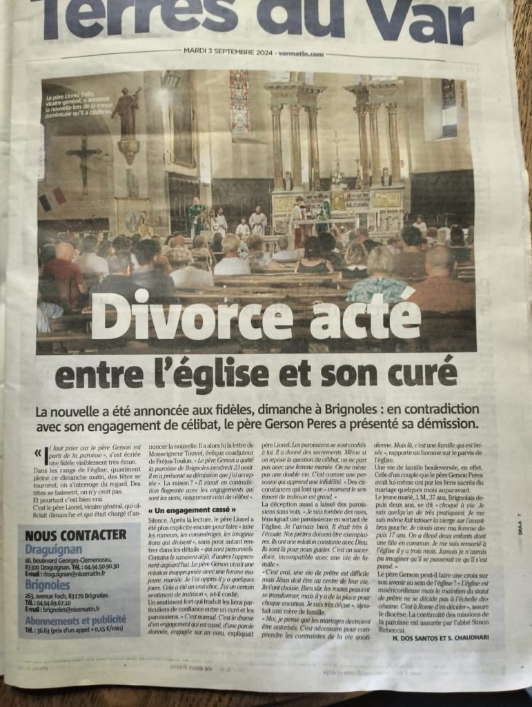 La presse locale rend compte du fait que le père Gerson Peres, curé de Brignoles dans le Var – diocèse de Toulon – a quitté sa paroisse le 23 août dernier. Le 1er septembre le vicaire général du diocèse, l’abbé Lionel Dalle, l’a expliqué aux paroissiens.