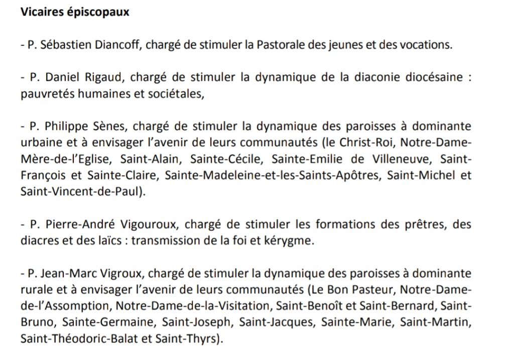 Et les attributions de cinq vicaires épiscopaux chargés de « stimuler » tel ou autre domaine.